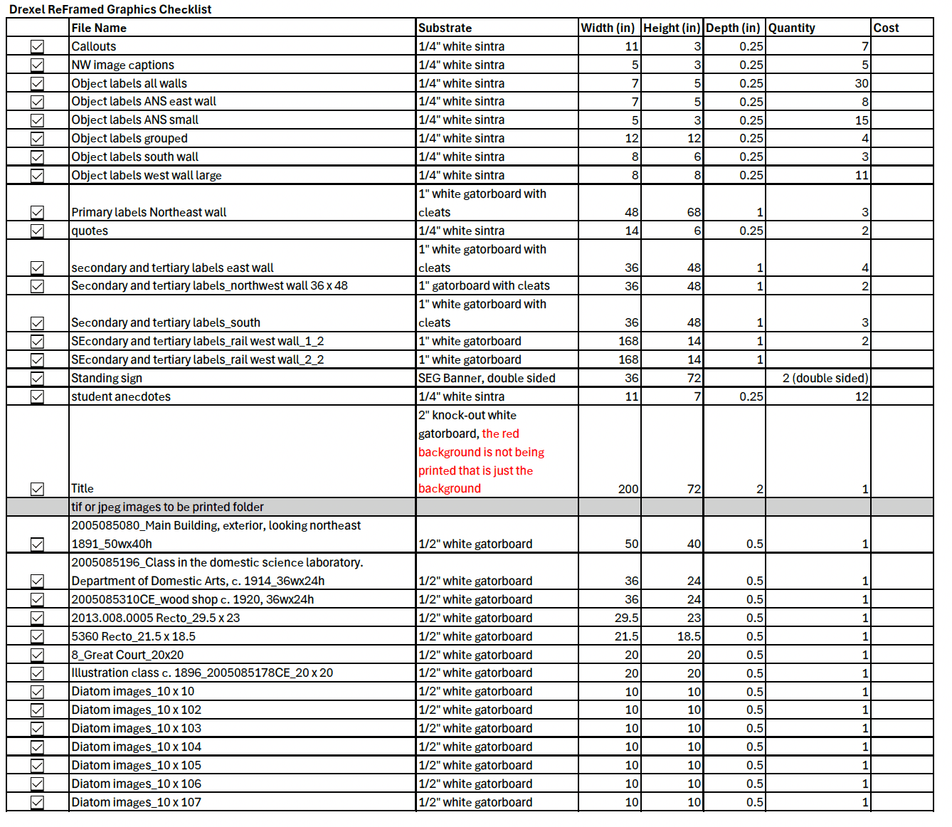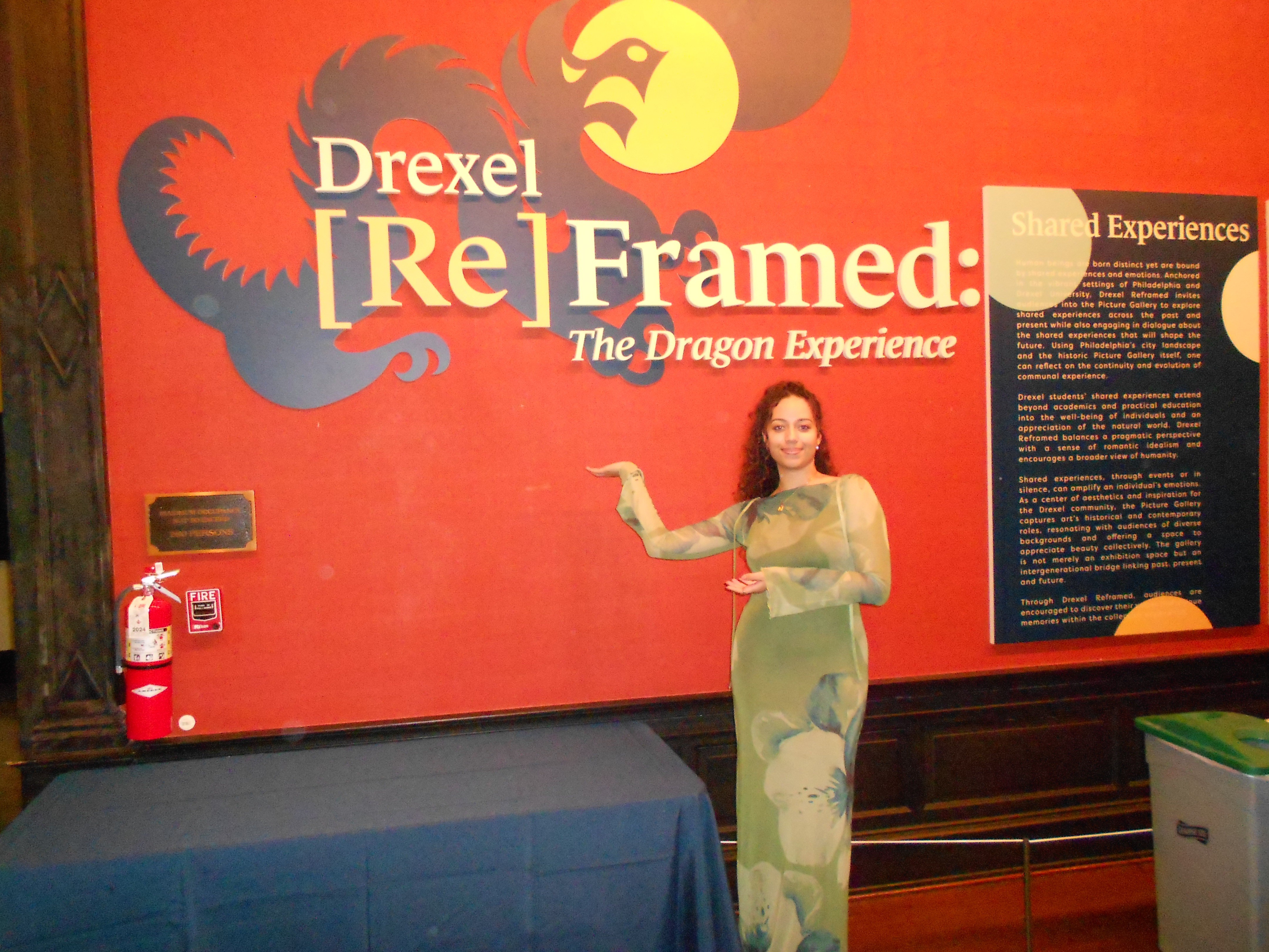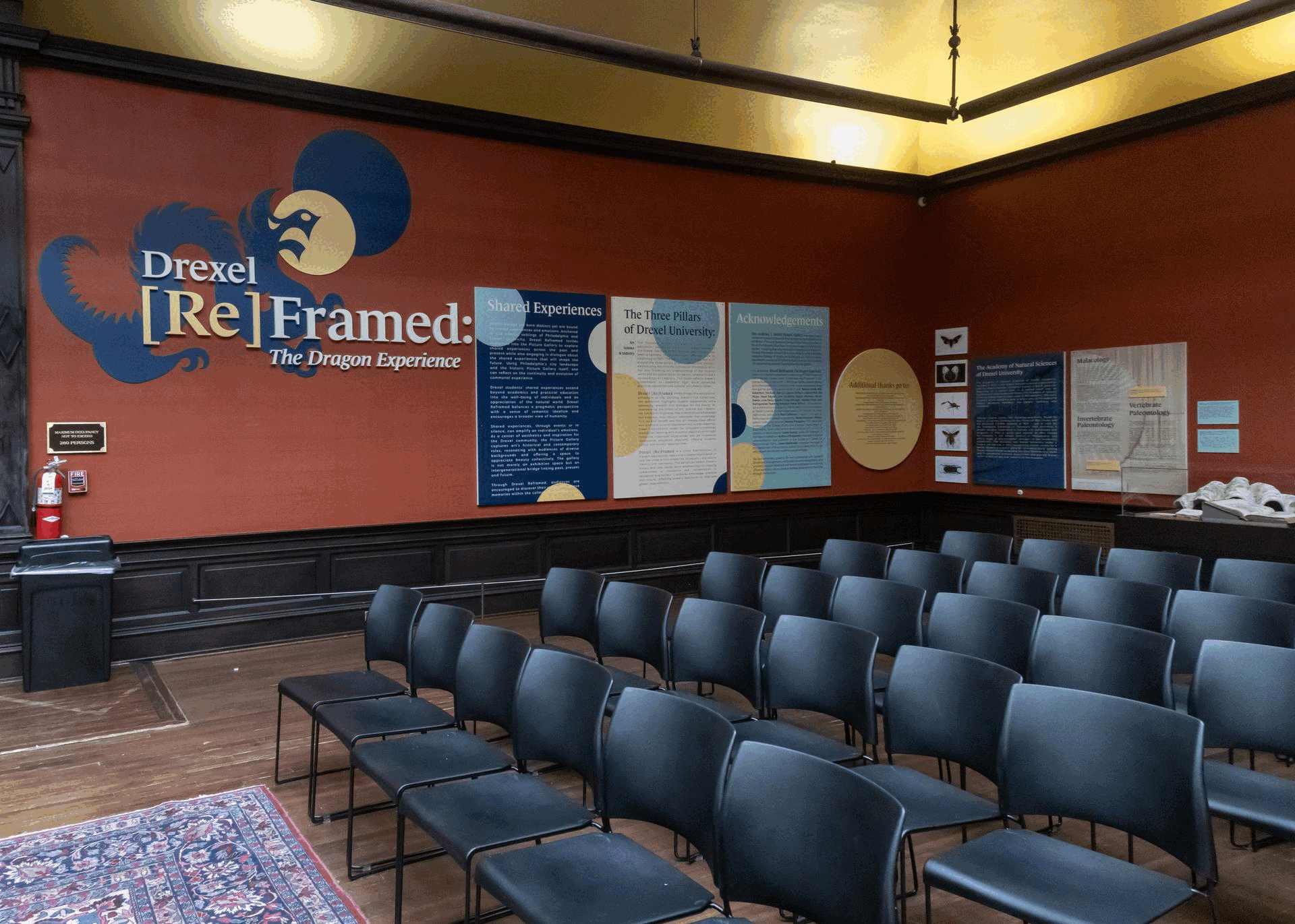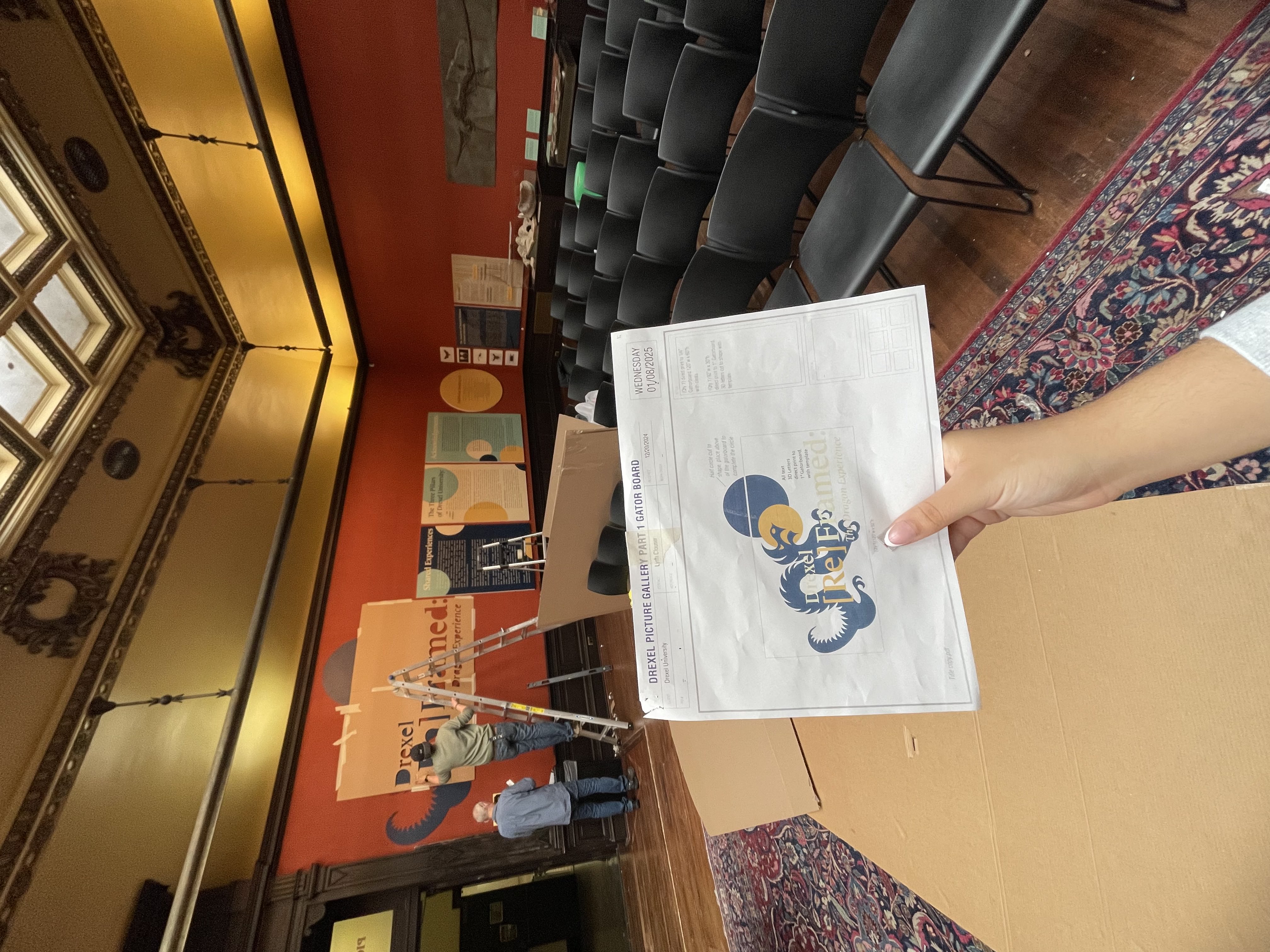 The design approach centered on accessibility, clarity, and cohesion. The color palette was carefully chosen to complement the In the Garden mural’s natural tones while balancing the unavoidable presence of the deep terra-cotta red from the DeWalt walls. This ensured a harmonious visual experience that did not feel disjointed. The typography and layout were designed to guide visitors intuitively through the space, ensuring a seamless flow of information. Student-written labels were carefully formatted to maintain consistency while allowing individual voices to stand out. The wayfinding system complemented the gallery’s new arrangement, reinforcing the themes of exploration and discovery. By harmonizing Drexel’s institutional legacy with contemporary student narratives, Drexel Reframed offers an immersive and educational experience that reflects the University’s evolving identity.