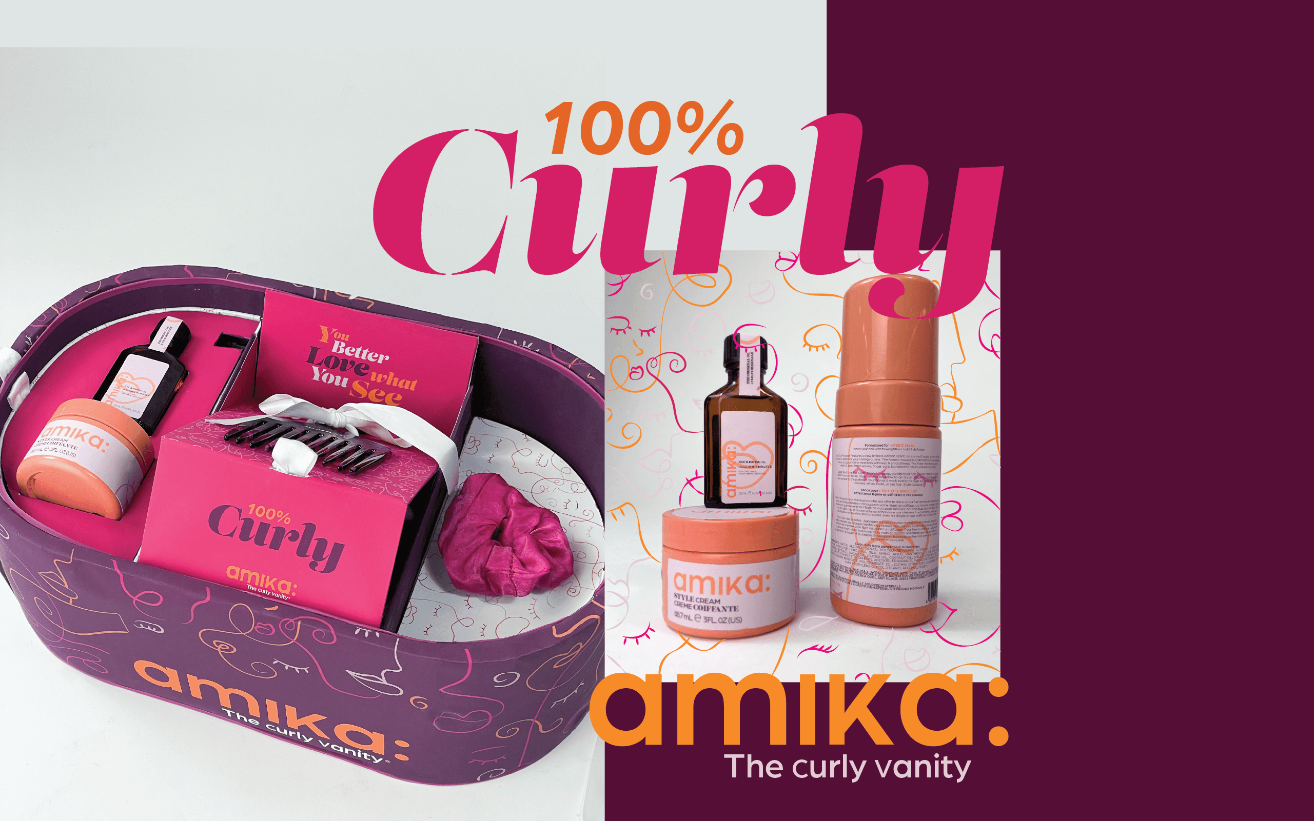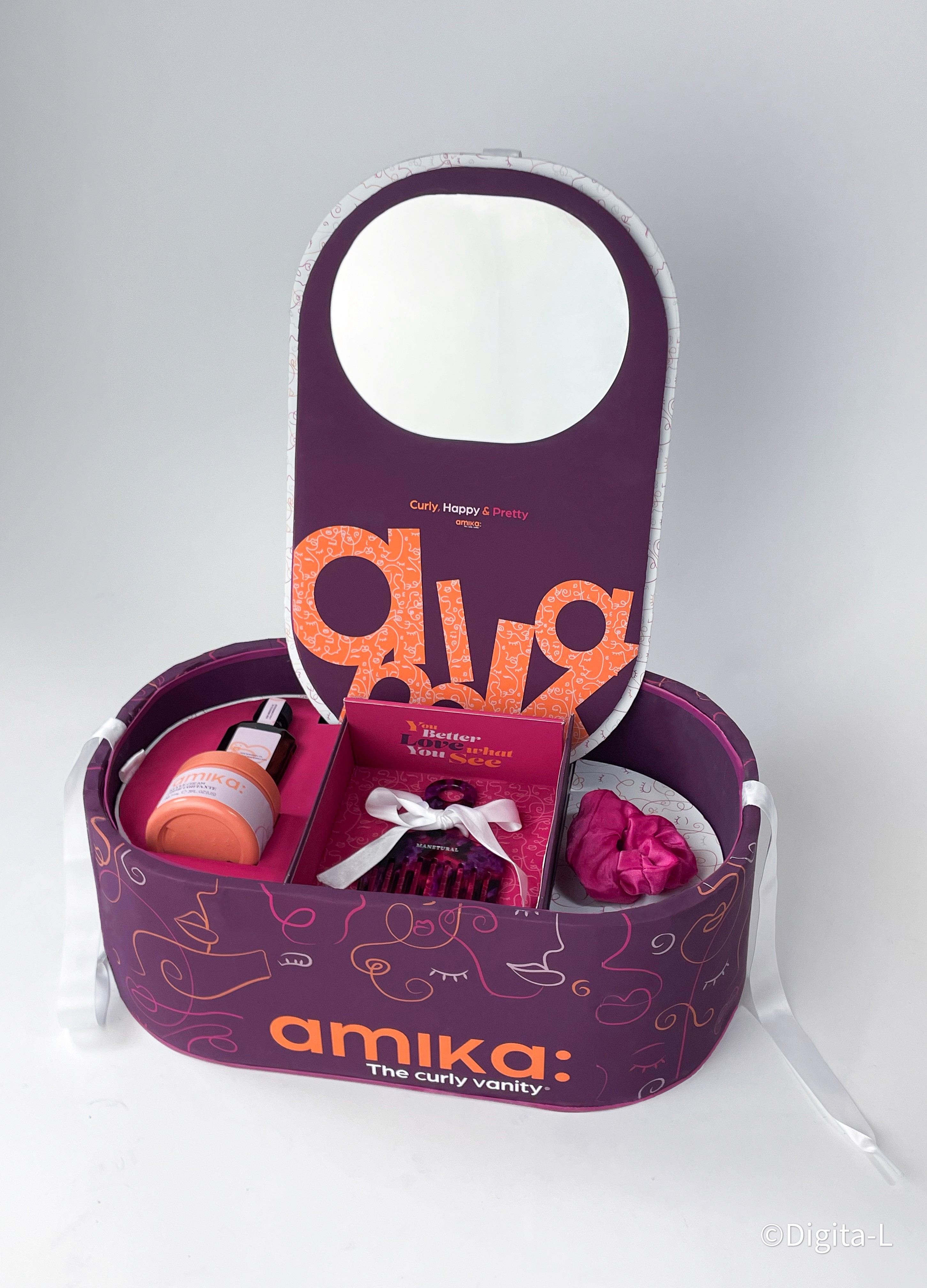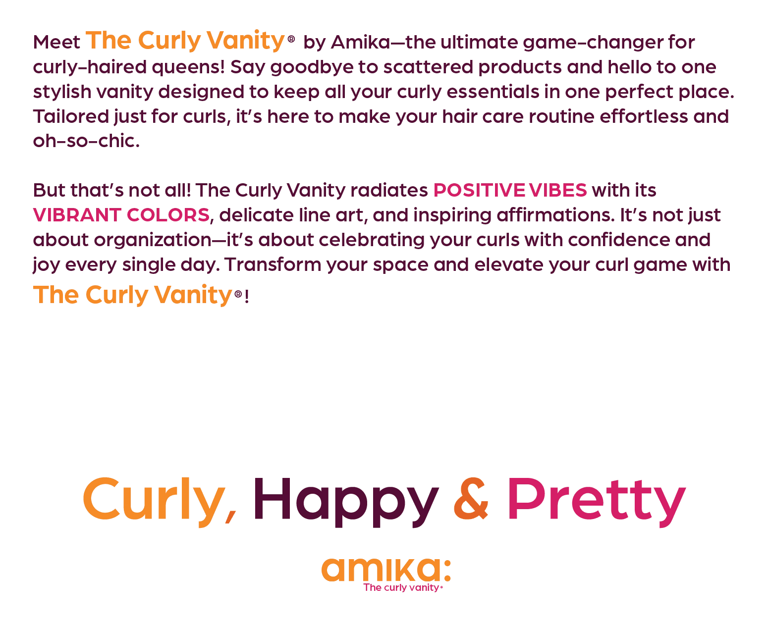 The Curly Vanity by Amika, a premium packaging concept designed for curly-haired consumers seeking a chic, organized solution for their hair care essentials. This curated vanity set features a selection of must-have products and accessories, including a styling cream, nourishing oil, curl mousse, hair scrunchy, pick, and satin bonnet. The package not only houses these items but also serves as a stylish storage unit that enhances the consumer's daily hair care routine.