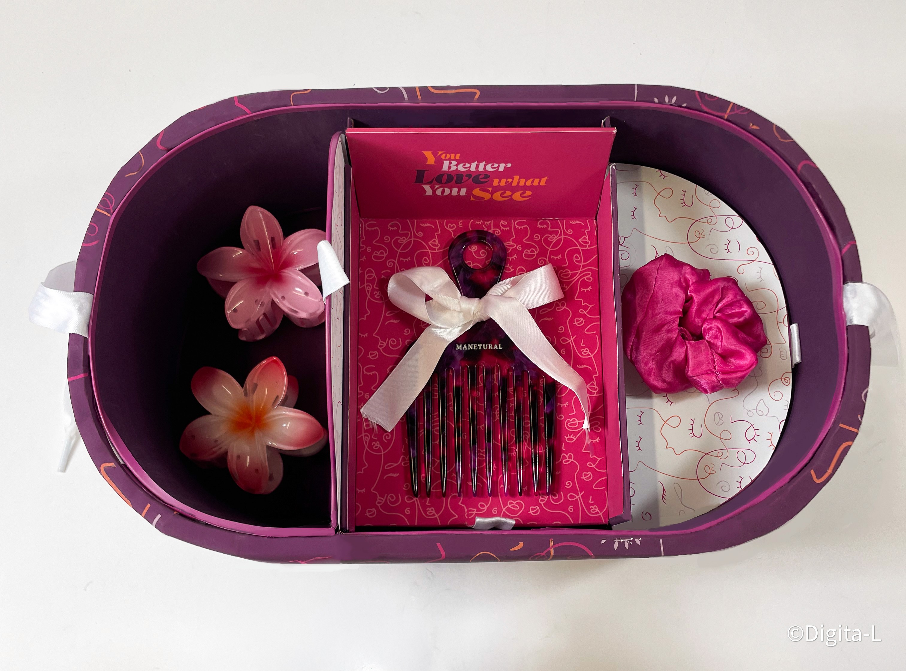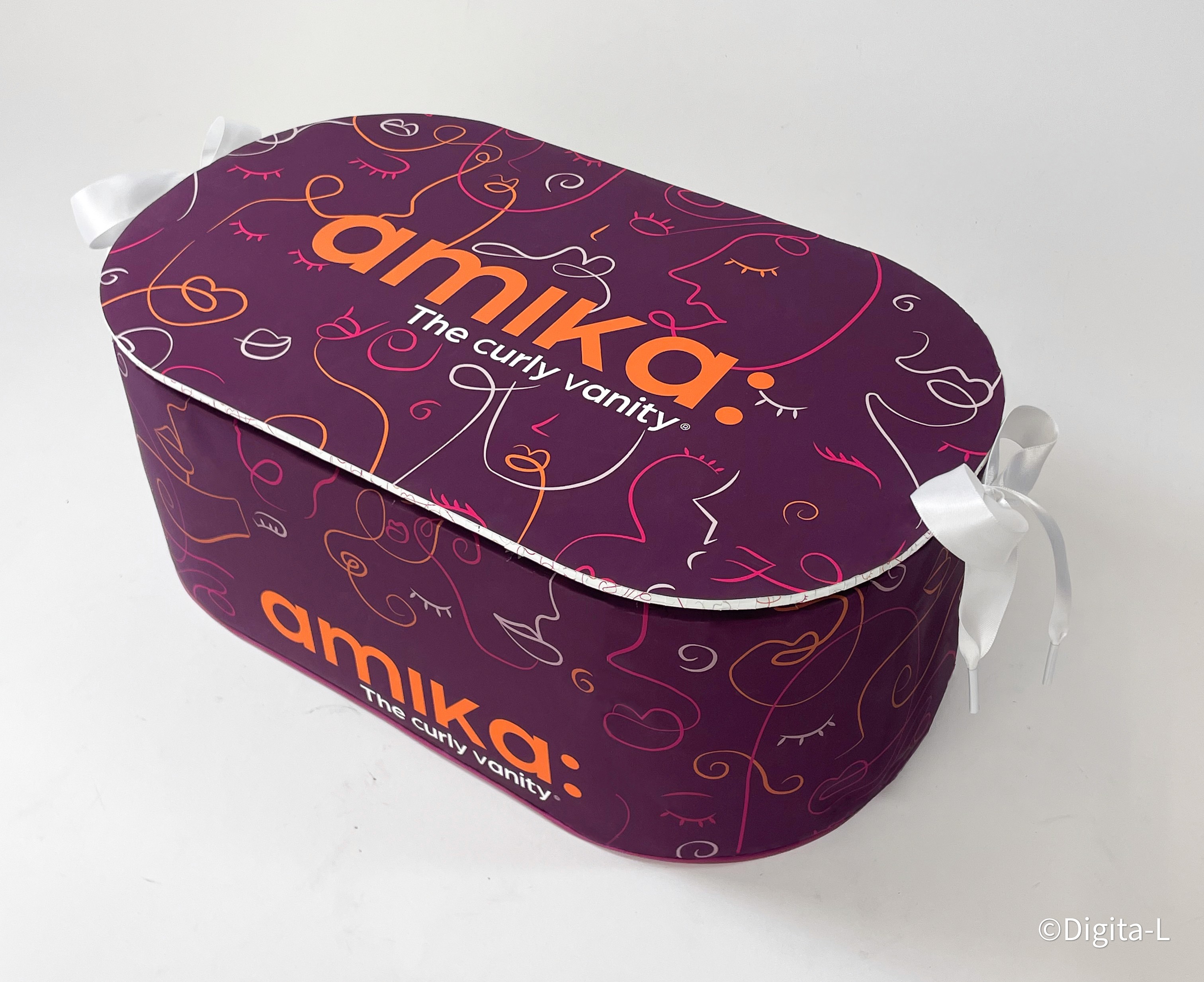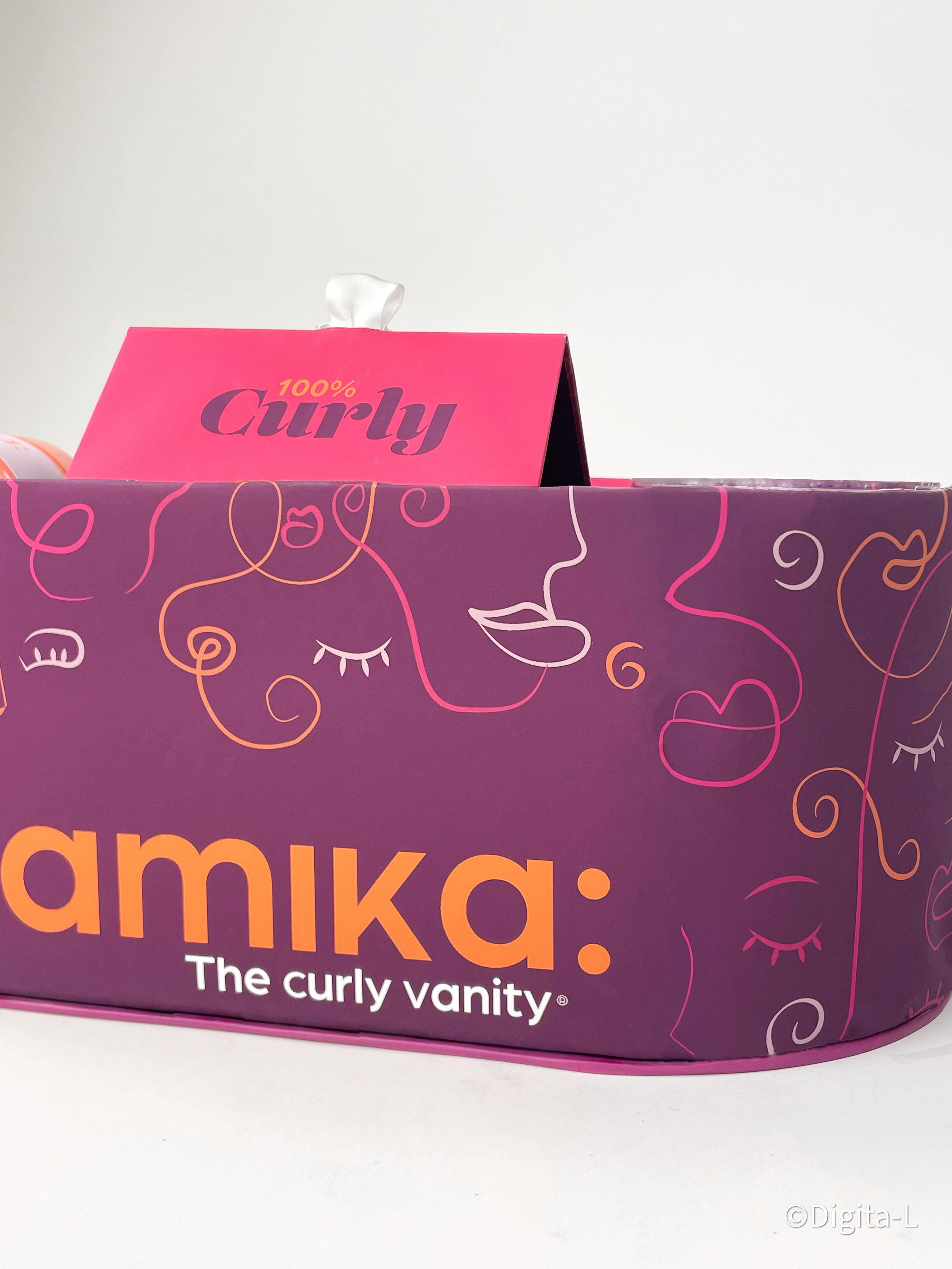 The Curly Vanity by Amika, a premium packaging concept designed for curly-haired consumers seeking a chic, organized solution for their hair care essentials. This curated vanity set features a selection of must-have products and accessories, including a styling cream, nourishing oil, curl mousse, hair scrunchy, pick, and satin bonnet. The package not only houses these items but also serves as a stylish storage unit that enhances the consumer's daily hair care routine.